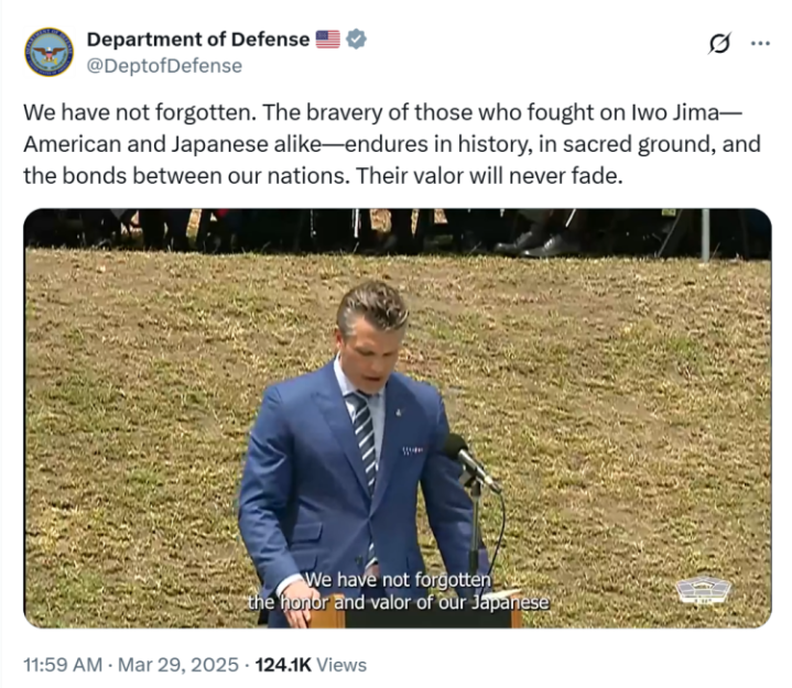 在亚洲上,美日也是舆论武器全开,日本疯狂否认南京大屠杀,疯狂否认日本在中国大地上犯下的种种罪行,更有甚者,美国为了拉拢日本,美国防长赫格塞思,在硫磺岛战役的纪念仪式上都做出了。要“牢记美日双方士兵的勇敢精神”,这种精神“在美日盟友关系中永垂不朽”的表态。